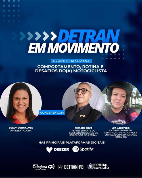 O programa Detran em Movimento do último sábado (21) discutiu o comportamento, rotina e desafios enfrentados pelos motociclistas no trânsito. Para falar sobre esse assunto, a radialista Suely Gonçalves conversou com o representante do Conselho Regional de Psicologia no Cetran e especialista em Psicologia do Trânsito, Ricácio Cruz, e com a vice-presidente da Associação de Motogirls e Entregadoras da Paraíba (Amen-PB), Lua Azzevedo.