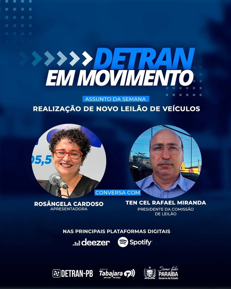 O Detran em Movimento é apresentado pela radialista Rosângela Cardoso e vai ao ar todos os sábados, às 7h, pela Rádio Tabajara FM (frequência 105,5 Mhz). Também está disponível nas plataformas de streaming. Você pode conferir este e outros episódios, procurando por Detran em Movimento em serviços como Spotify, Deezer, Rádio Public, Anchor, outro de sua preferência, ou clique no player abaixo para ouvir o programa aqui do site do Detran-PB.